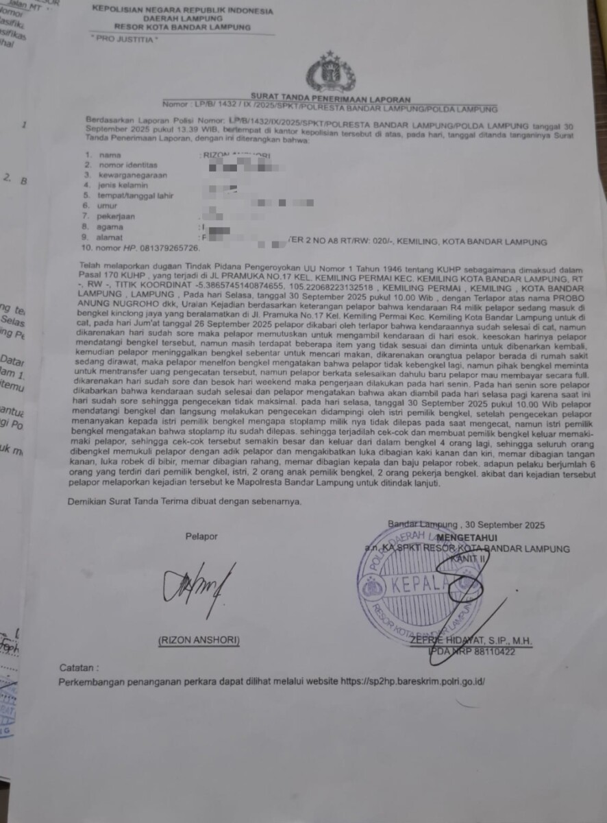 Peristiwa tersebut terjadi pada Selasa, 30 September 2025 sekitar pukul 10.00 WIB. Laporan korban telah diterima pihak kepolisian dengan Nomor LP/B/1432/IX/2025/SPKT/POLRESTA BANDAR LAMPUNG/POLDA LAMPUNG, tercatat sekitar pukul 13.39 WIB. Terlapor utama dalam kasus ini berinisial PAN , bersama beberapa orang lainnya.