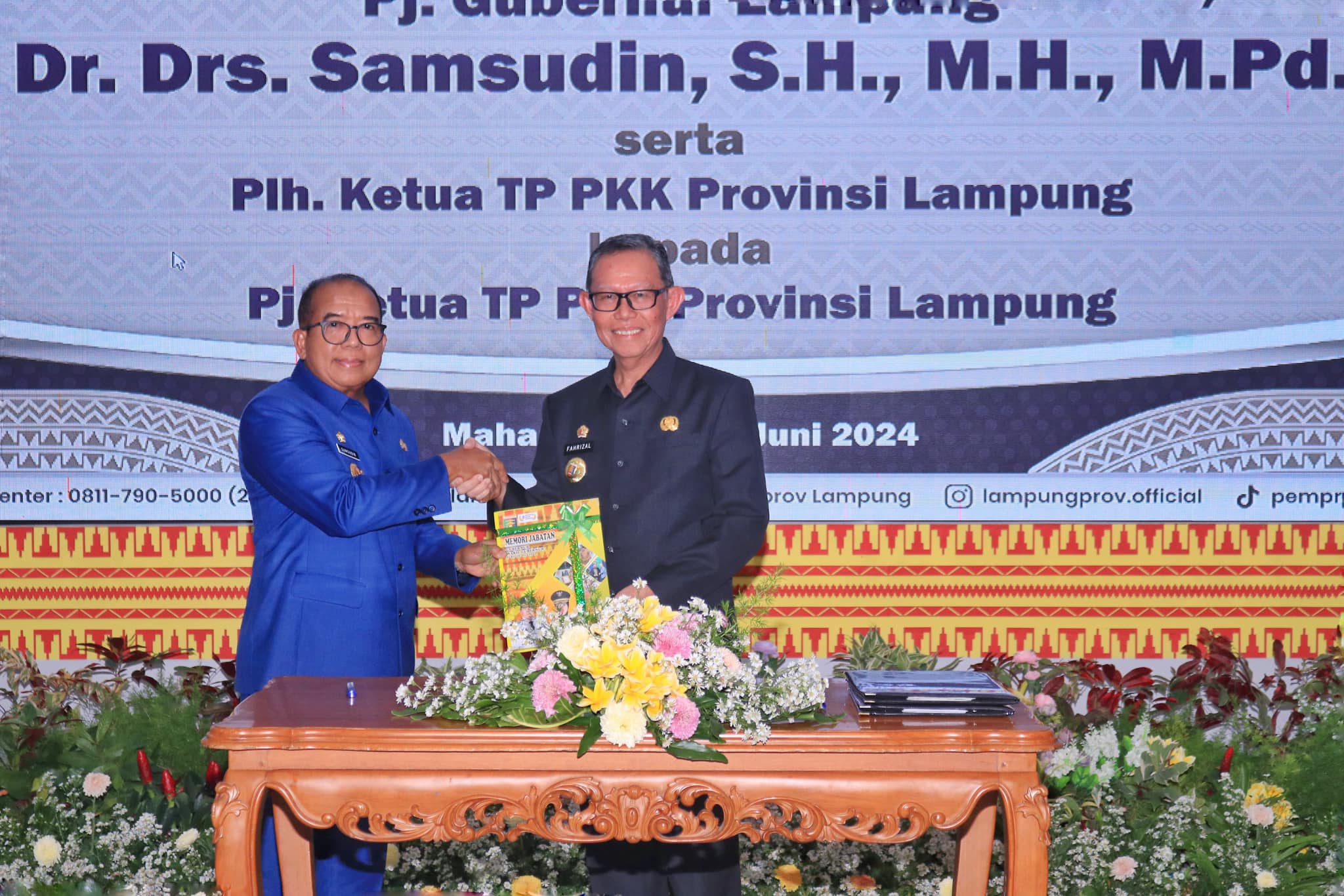 “ini bukanlah pekerjaan yang mudah. Tapi Saya yakin dan percaya, bahwa dengan kebersamaan dan dukungan Saudara-saudara dari seluruh institusi serta elemen masyarakat yang ada di Provinsi Lampung, maka program-program pembangunan Daerah yang telah tersusun dalam Rencana Kerja Pemerintah Daerah Provinsi Lampung sebelumnya, akan dapat terlaksana dengan baik,” demikian disampaikan oleh Pj Gubernur Lampung Samsudin saat menghadiri kegiatan Serah Terima Jabatan Plh. Gubernur Lampung Fahrizal Darminto kepada Pj. Gubernur Lampung Samsudin serta Plh Ketua TP PKK Provinsi Lampung Mamiyani Fahrizal kepada Pj. Ketua TP PKK Provinsi Lampung Maidawati Retnoningsih, di Mahan Agung, Rumah Dinas Jabatan Gubernur Lampung, Kamis (20/06/2024).