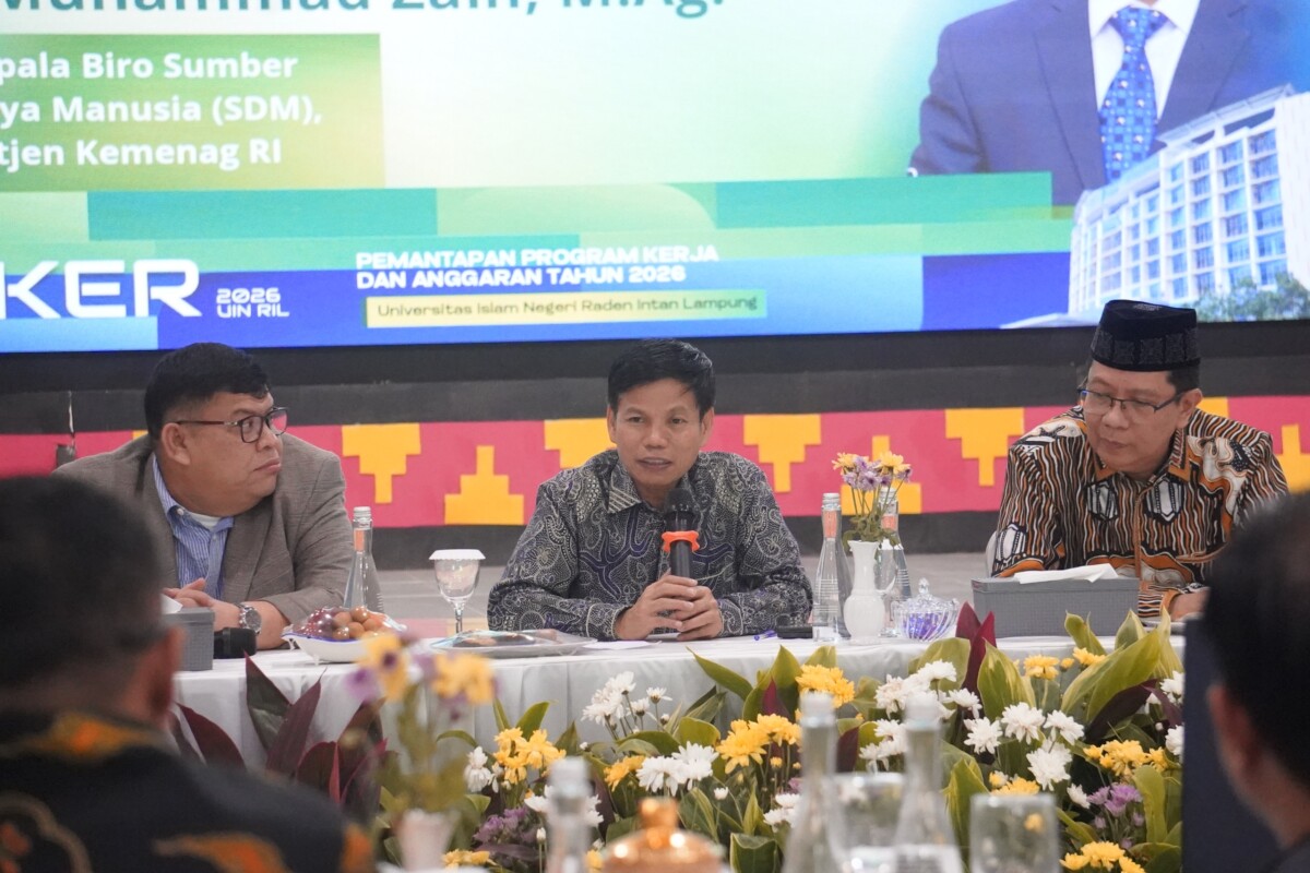DISWAYLAMPUNG.ID – Kepala Biro SDM Kementerian Agama RI, Dr. Muhammad Zain, M.Ag., memberikan arahan dalam Rapat Kerja Pemantapan Program Kerja dan Anggaran Tahun 2026 Universitas Islam Negeri (UIN) Raden Intan Lampung (RIL) di Lamban Raden Intan, Jumat (17/4). Ia menekankan pentingnya pembenahan dan peningkatan tata kelola kepegawaian serta penguatan kualitas ASN.