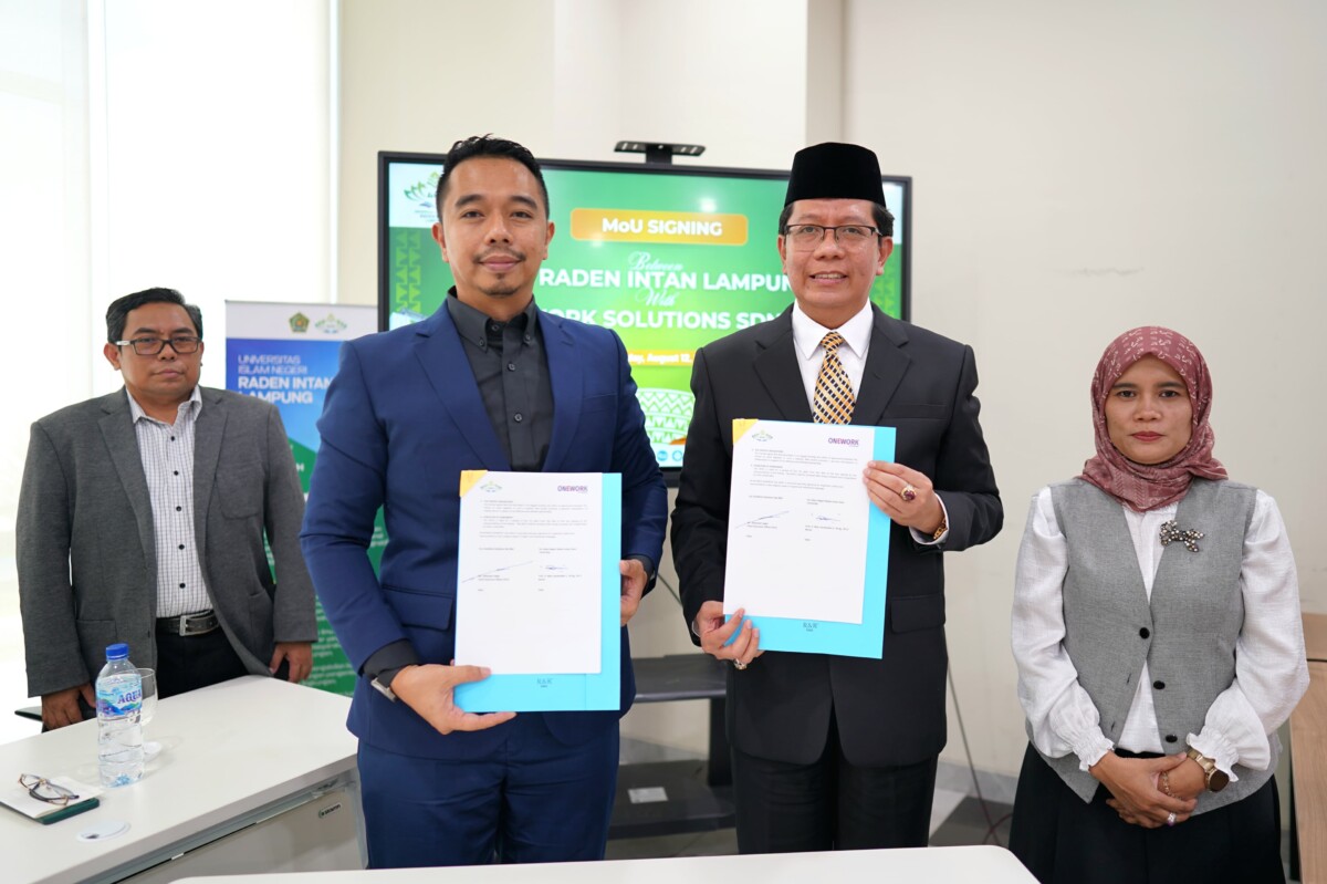 Penandatanganan nota kesepahaman (MoU) dilakukan oleh Rektor UIN Raden Intan Lampung, Prof. H. Wan Jamaluddin Z, M.Ag., Ph.D., dengan CEO Onework Solutions, Mr. Abbyamir Sapie.