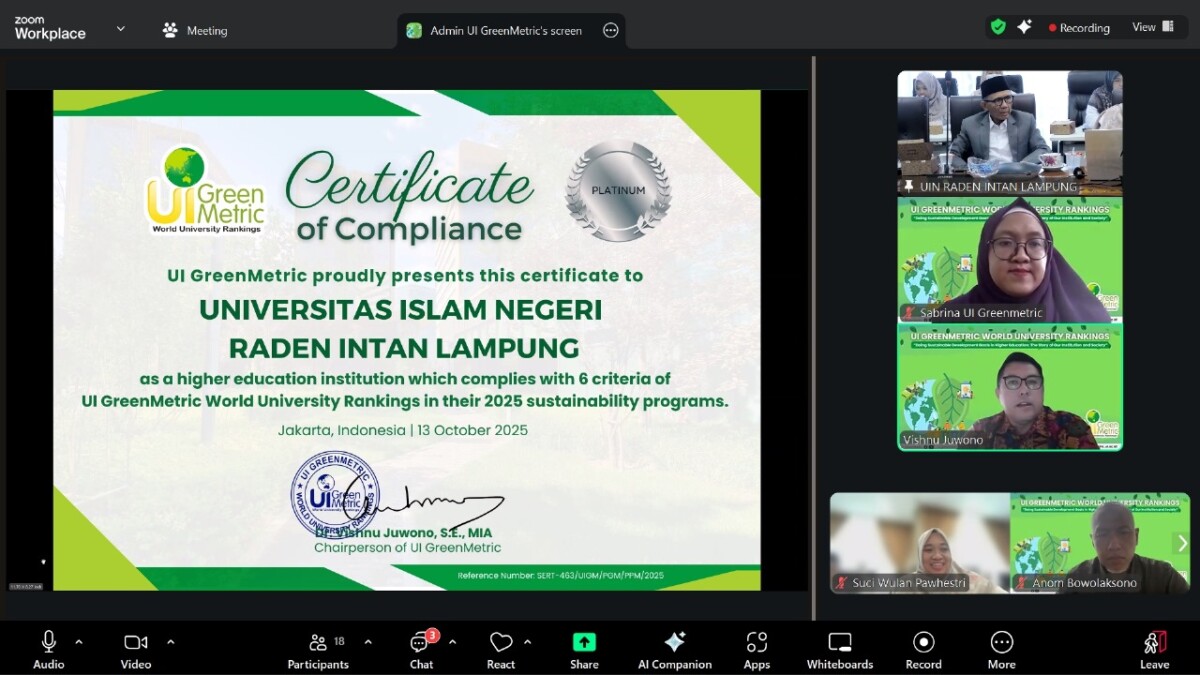 DISWAYLAMPUNG.ID – Universitas Islam Negeri (UIN) Raden Intan Lampung (RIL) kembali mencatat prestasi dalam pengelolaan lingkungan kampus berkelanjutan. Tahun ini, UIN RIL berhasil mempertahankan Certificate of Compliance dari UI GreenMetric World University Rankings dengan nilai 4 dari 5 pohon (Trees Rating).