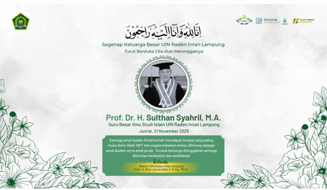 DISWAYLAMPUNG.ID – Keluarga Besar Universitas Islam Negeri (UIN) Raden Intan Lampung (RIL) menyampaikan duka cita mendalam atas wafatnya Prof. Dr. H. Sulthan Syahril, MA, Guru Besar Bidang Ilmu Studi Islam. Almarhum menghembuskan napas terakhir pada Jumat, 21 November 2025, pukul 10.27 WIB di RS Advent Bandar Lampung. Kabar duka ini meninggalkan kesedihan mendalam bagi keluarga, kerabat, dan sivitas akademika.